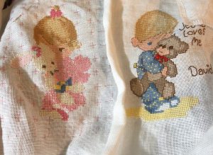 By then, I had had my first baby and wanted to stitch the “Jesus Loves Me” design for his birth sampler and then later on, one for my older daughter. When I discovered I could customize the words and the colors to match what I wanted, I knew that I had found my hobby. It’s something I still enjoy today and oddly enough, I’m back stitching the same two designs for my grandson and granddaughter!